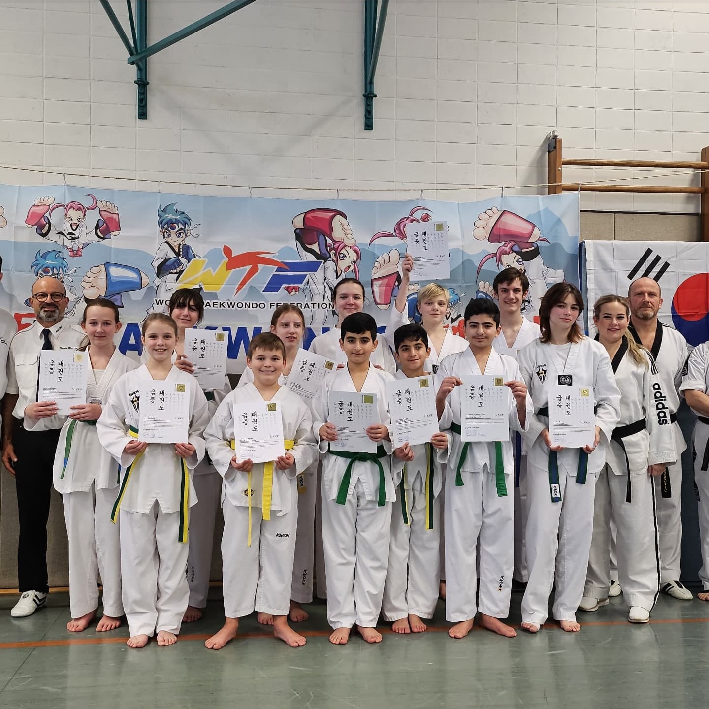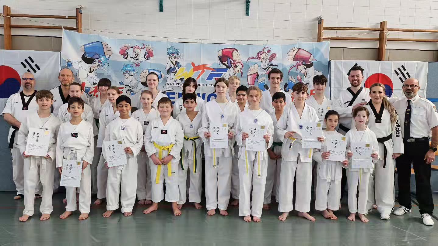 Stolze Gesichter bei Prüflingen und Trainern unserer Taekwondo-Abteilung nach bestandener Kup-Prüfung! 💪🏻😊