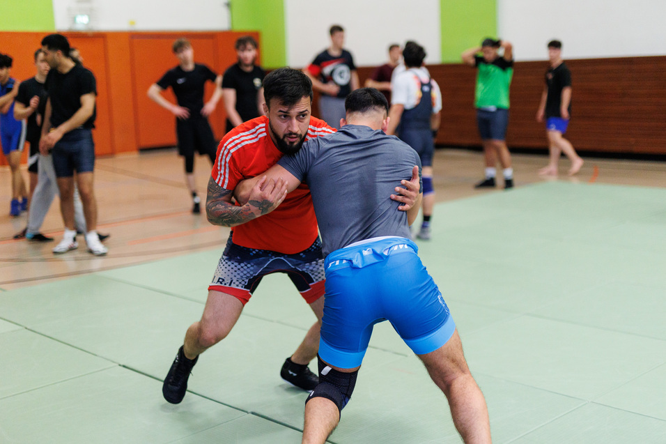 Bildunterschrift: Jaber Sultanj (rotes Trikot, da Heim-Mannschaft) bereitet seinen Schultersieg vor