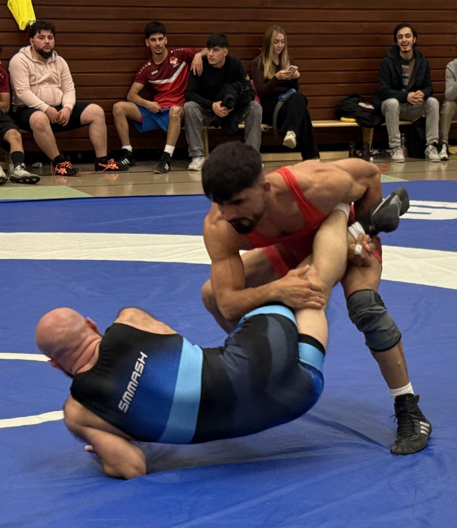 Bild: Roni Hussein (rot) hält Isa Akdogan (blau) zum Schultersieg (beide Schulterblätter auf der Matte)