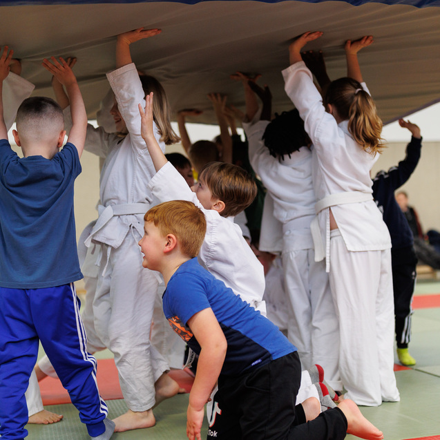Die Gruppe Spielerisch Mutig beschäftigt sich mit dem spielerischen Lösen von Problemen durch verschiedene Sportspiele.